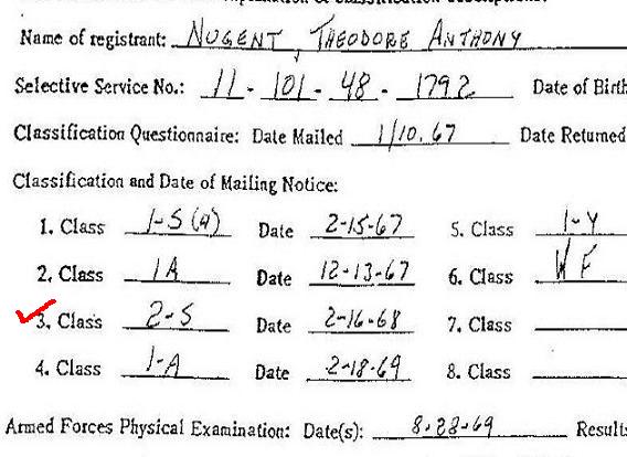 Ted Nugent, self-proclaimed tough guy and warrior for freedom, dodged the Viet Nam war when he had his chance. At the time of his eligibility, he took a student deferment (a 2- S in ’68) at Oakland Community College in Michigan. Nugent also later held a medical deferment (a 1-Y in ’69). [Both are shown in his selective service paperwork. For an enlargeable version click here.)