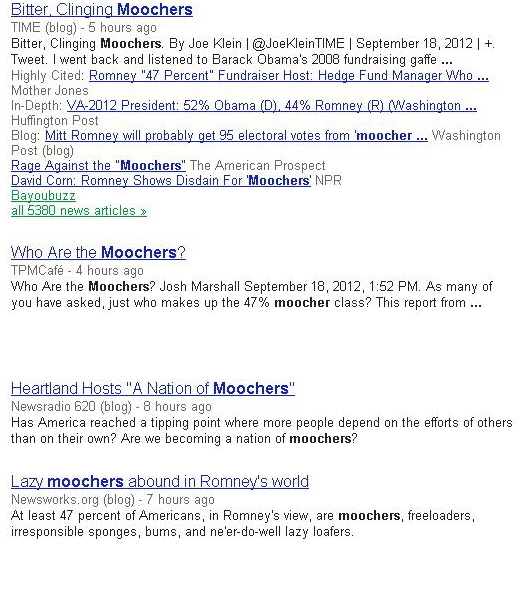 And so it has come about that the singularly libertarian Ayn Rand usage — moochers — dominated the news on Romney’s secret speech today.