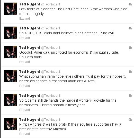 I would have paid a movie fare to see the blood squirt from the corners of Ted Nugent’s eyes like a Texas horned toad before the man collapsed in a heap on the floor in Waco. I have heard Nugent is on an obscure Turkish painkiller called Wallot to control the agony of exploding kidney stones from decades of over-consumption of fatty hog meat and diet soda. Wallot can loosen inhibitions leading to crazy outbursts of reptile-like hissing and subsequent unconsciousness.