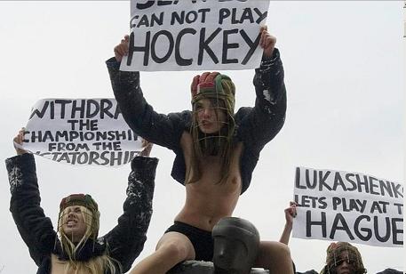 My favorite unique social protest group, the Ukrainian FEMEN, again in a collection of photos, this time in Zurich, Schweiz (the well known country for stealth banking and corporate wealth tax evasion), protesting the Hockey World Cup.