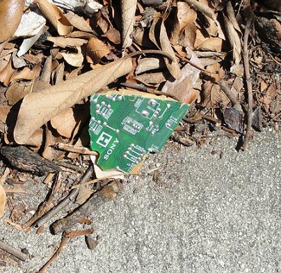 A perfect visual metaphor for our listless country: A broken piece of circuit board from a worthless bit of consumer electronics, made in China for Sony, amid leaves and litter on a concrete bridge over the pitiless super-highway bisecting Pasadena. Unless someone picks it up or strong wind blows it away, it could be there for the next ninety years, immutable.